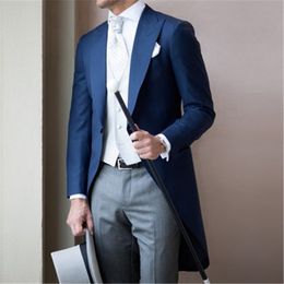 Moderne Blau Lange Mantel M�nner Anzug 3 St�ck Jacke Pants Weste Tie Neueste Hochzeit Prom Br�utigam M�nner Anz�ge Smoking Terno Masculino